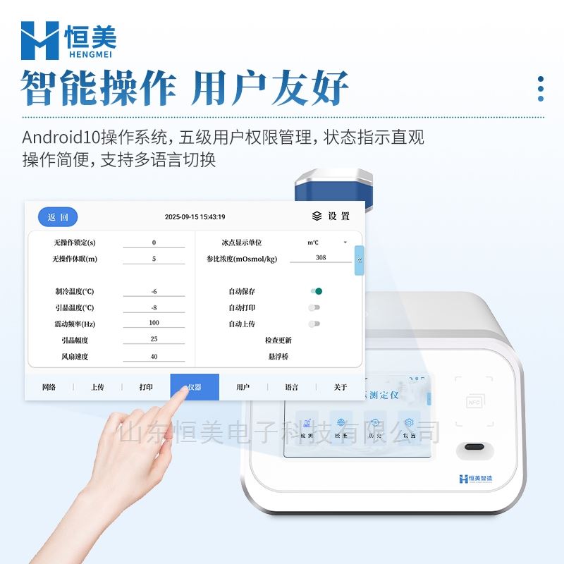 2025-11-17 冰点渗透压测定仪制药溶液摩尔浓度检测仪器,冰点渗透压检测仪基于拉乌尔冰点下降原理,采用半导体制冷技术和高精度温度传感器,实现溶液渗透压摩尔浓度的快速、精准、可靠测量。仪器配备高清触控屏,操作界面直观简洁,具备自动测量、结果存储、数据追溯及报告打印等多种实用功能。其测量结果严格符合《中国药典》及相关国际标准的要求,核心部件稳定耐用,确保了仪器在长期使用中的重复性与再现性。